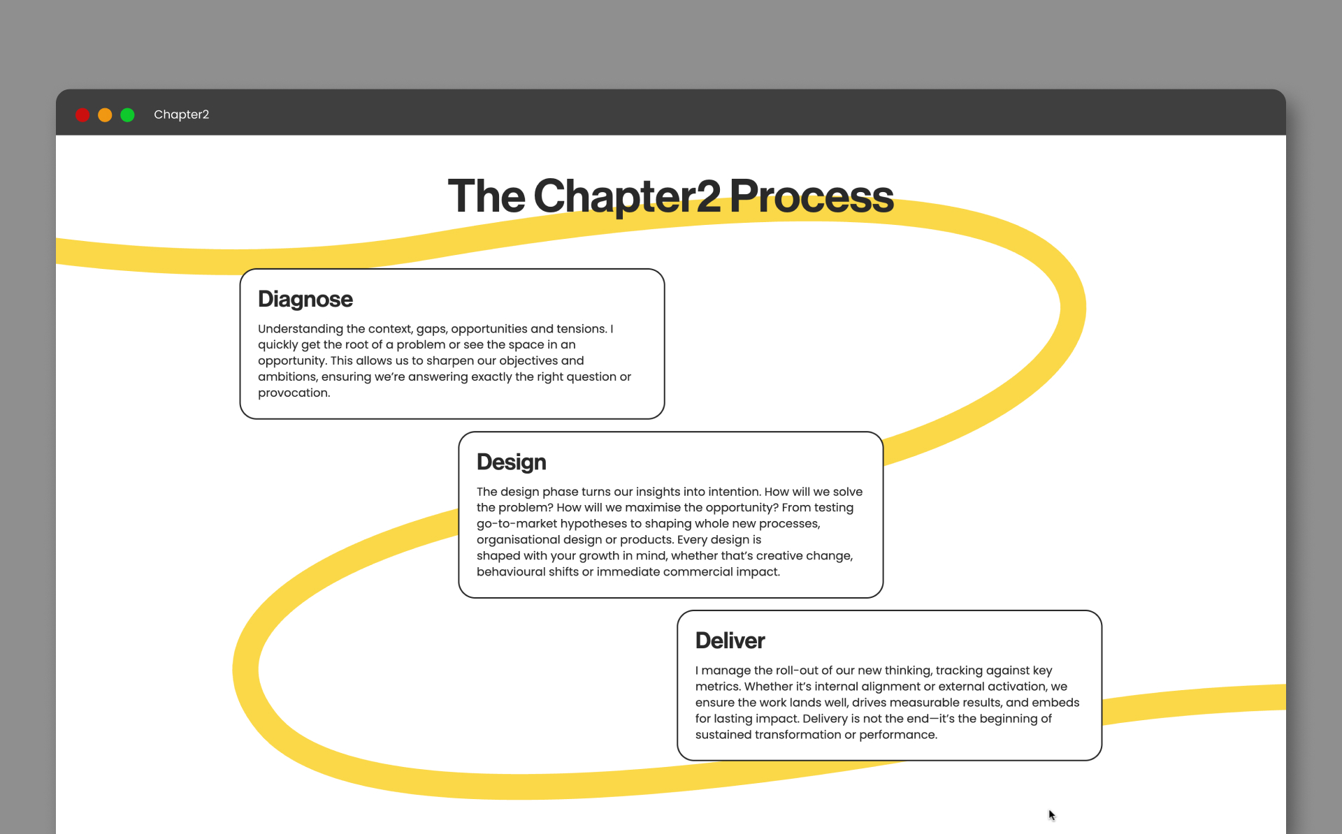 Chapter2's initial brand was in need of an update, Chris wanted to add some colour and make the brand more playful. After some experimentation, we developed a mustard yellow to compliment the slate black and pure white colour palette. Secondly, D&n developed a yellow squiggle asset inspired by the number 2. This helped to add creative flair and expression to the brand, something that Chris was keen to do.