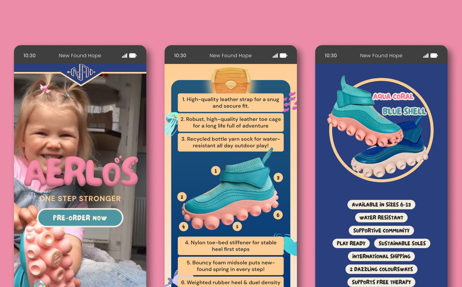 A playful and dynamic custom website for the innovative shoe start-up, AERLOS, to help children overcome toe-walking.
