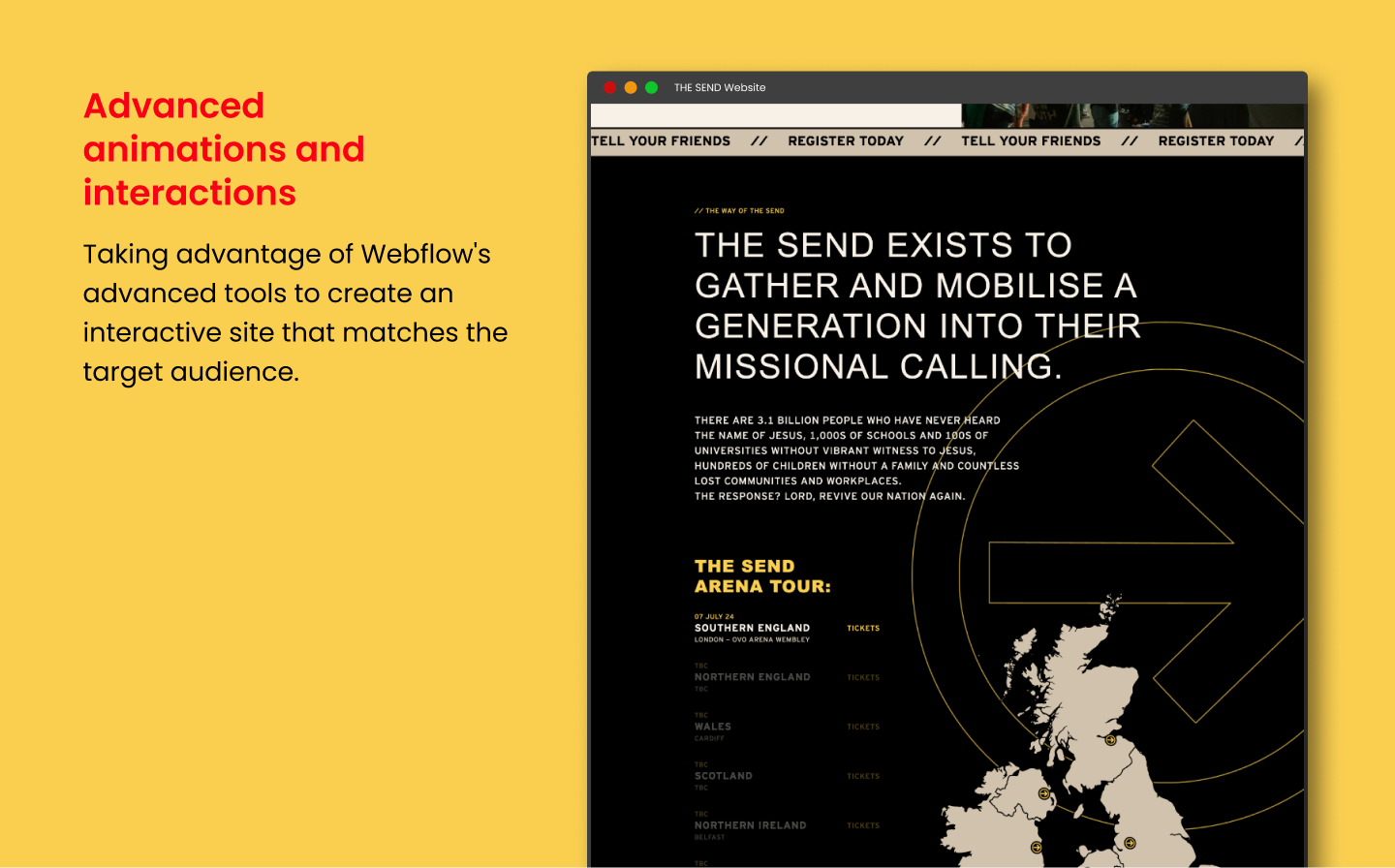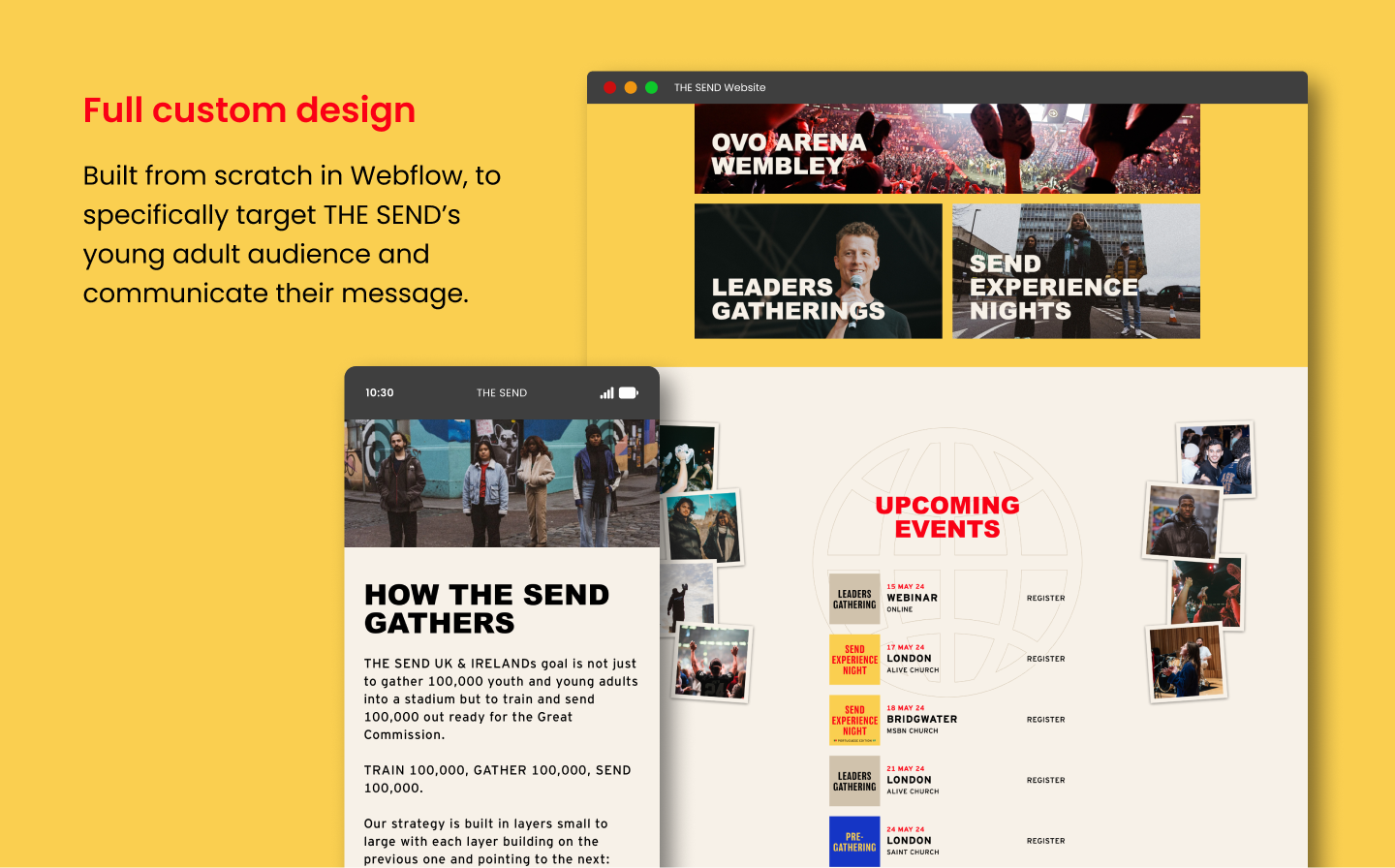 D&n led the full design and Webflow development of thesend.uk and thesend.ie, creating a scalable, high-performance digital platform for one of the largest Christian youth and evangelism movements operating across the UK and Ireland.